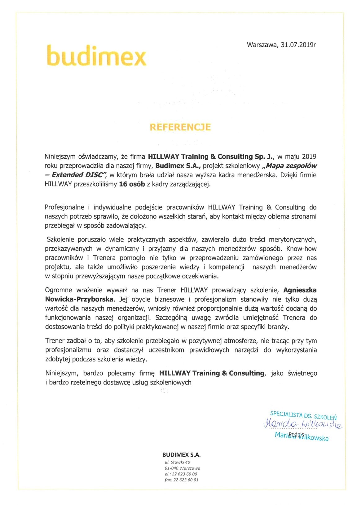 Z przyjemnością informujemy, że do grona zadowolonych Klientów HILLWAY dołączyła Grupa Budimex. Grupę Budimex, która tworzy jedną z największych grup budowlanych w Polsce. Jest również rozpoznawalna i ceniona od wielu lat za granicą, a początki jej działalności sięgają aż roku 1968. Cieszymy się, że mogliśmy przyczynić się do rozwoju firmy, serdecznie dziękujemy za referencję oraz liczymy na dalszą udaną współpracę.