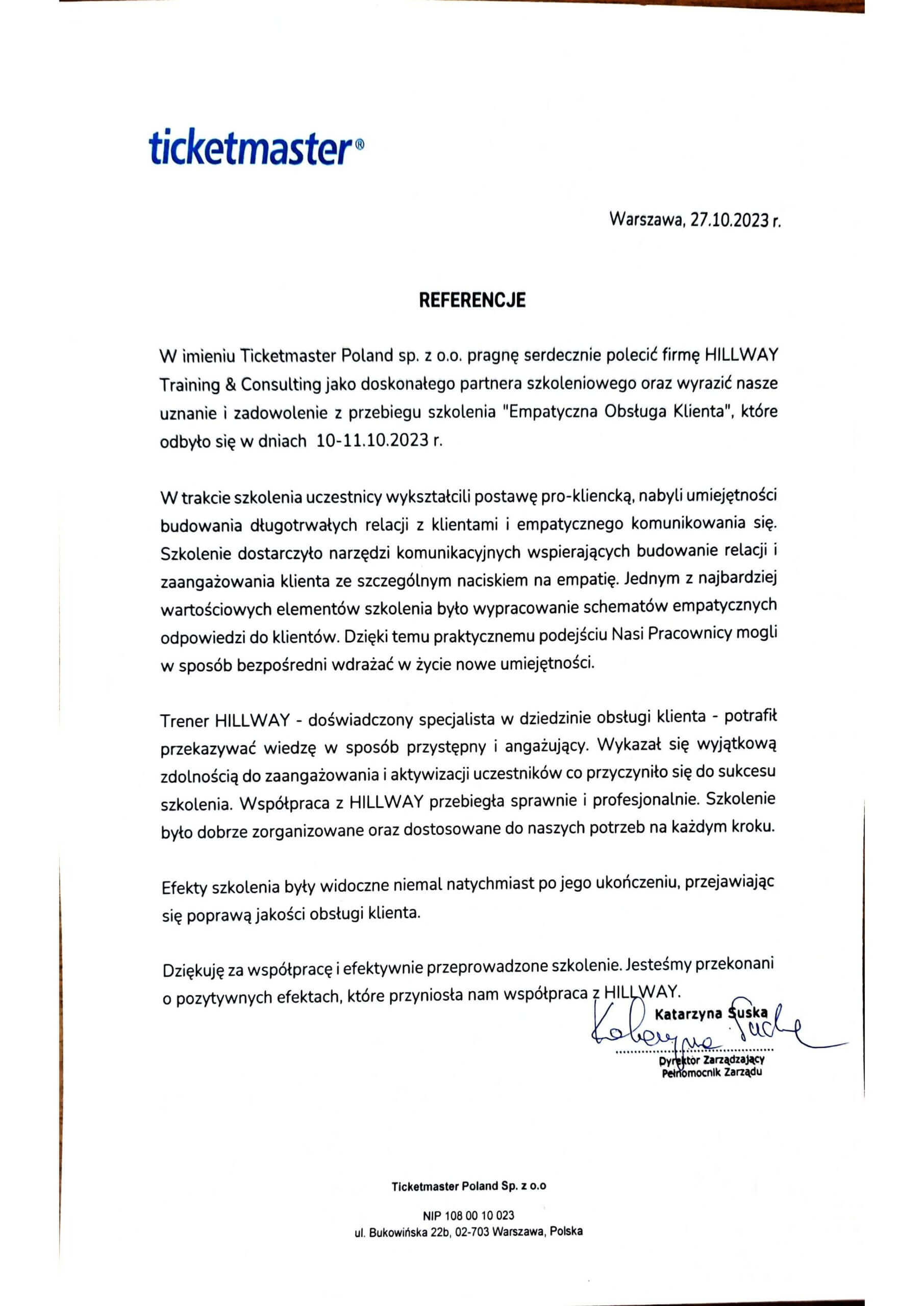 Poniżej przedstawiamy list referencyjny dla HILLWAY otrzymany od Ticketmaster Polska – światowego lidera w sprzedaży biletów. Dla Klienta zrealizowaliśmy szkolenie Empatyczna obsługa klienta